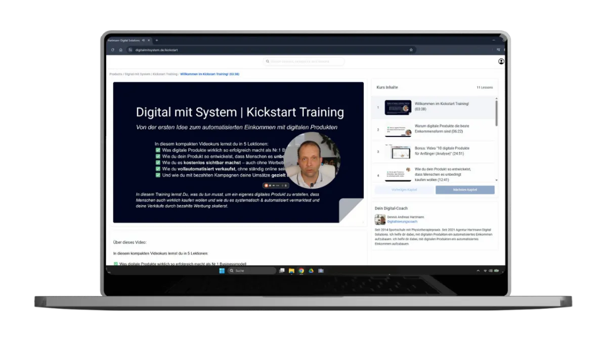 In 13 konkreten Lektionen ausgewähltem BONUS-Material lernst Du warum digitale Produkte das Geschäftsmodel Nr.1 sind & wie Du selbst digitale Produkte nach einer Schritt-für-Schritt Anleitung erstellst, vermarktest und automatisiert verkaufst.